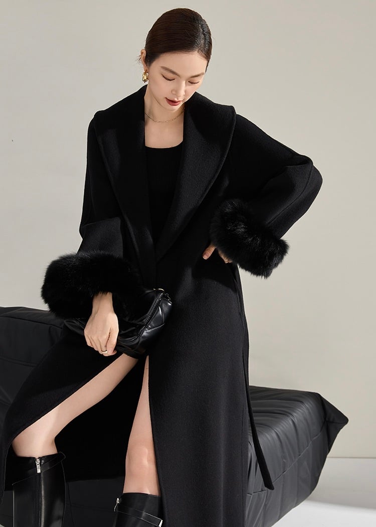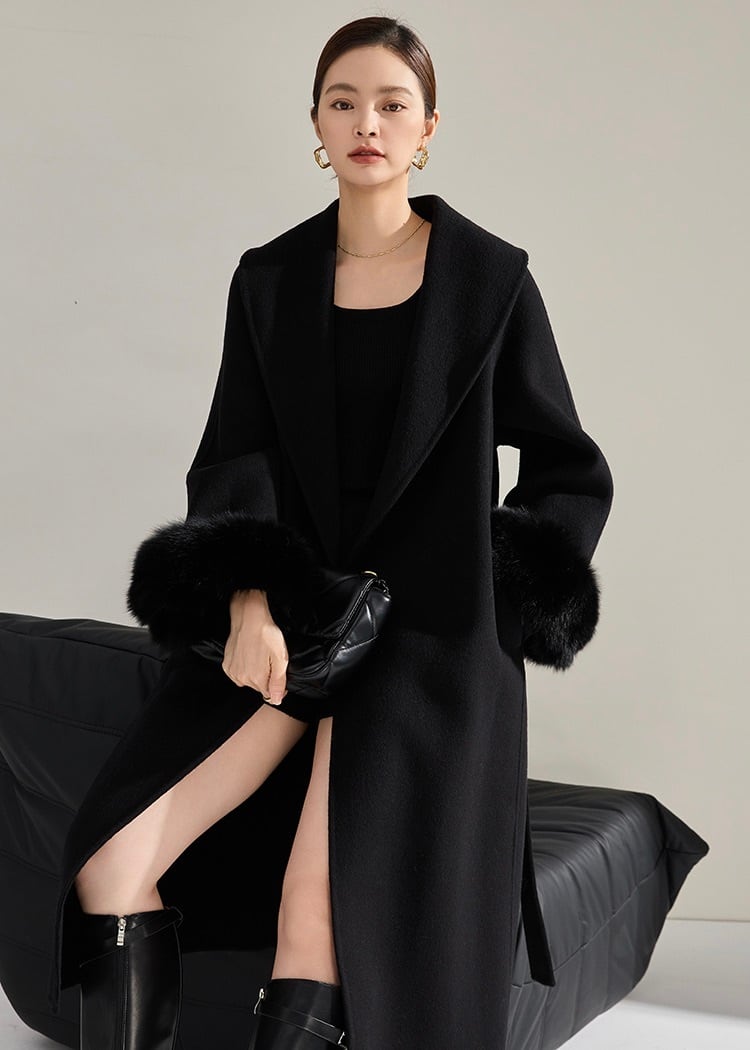 【Premium】フォックスファー付きロングウールブレンドリバーコート-ブラック